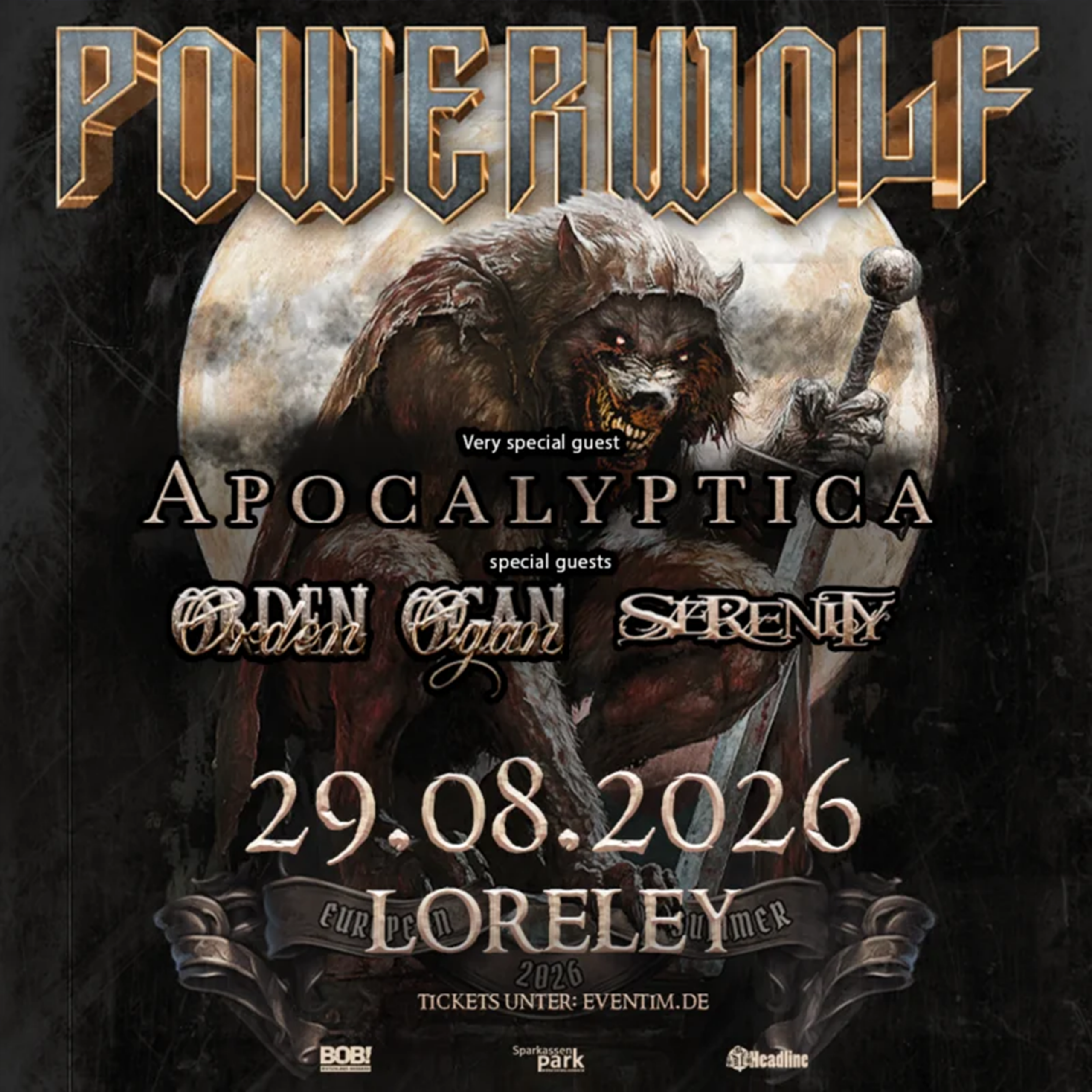 Am 29. August 2026 wird die berühmte Freilichtbühne auf der Loreley zum Schauplatz eines besonderen eintägigen Festivals: Powerwolf laden gemeinsam mit Apocalyptica, Orden Ogan und Serenity zu einem abwechslungsreichen Tag voller Metal ein. Vor der beeindruckenden Kulisse hoch über dem Rhein erwartet die Besucher eine Reihe kraftvoller Live-Auftritte, stimmungsvolle Momente und ein Konzertabend, der von Powerwolf als Headliner gekrönt wird. Ein Festivaltag, der die besondere Atmosphäre der Loreley mit der geballten Kraft des Metal vereint.