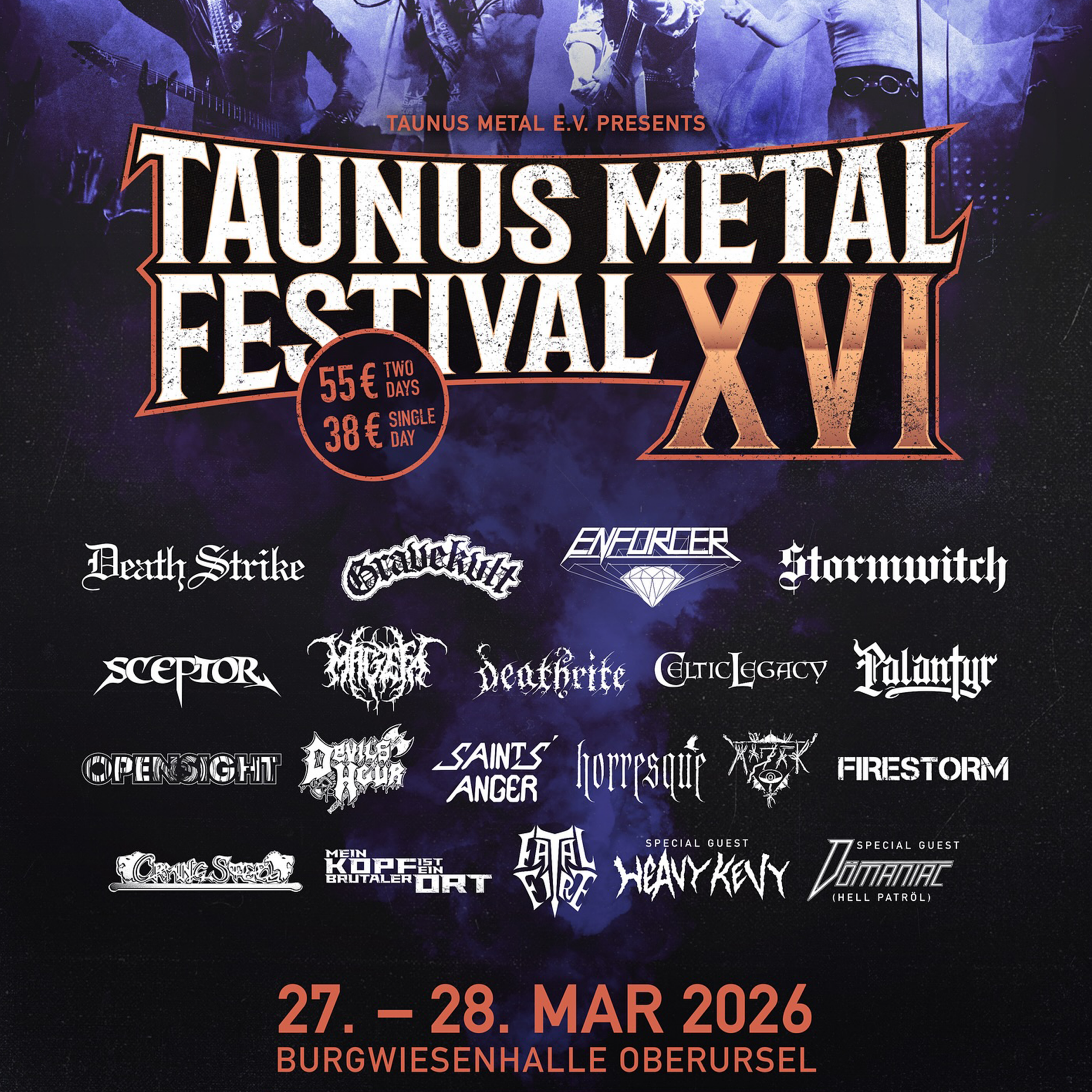 Das Taunus Metal Festival XVI findet in der altbekannten Location in der Burgwiesenhalle, Im Himrich 9, 61440 Oberursel statt und wird euch vom Taunus-Metal e.V. präsentiert. Das Taunus Metal Festival ist ein gemeinnützig organisiertes Metal-Festival, bei dem es darum geht, lokalen Bands sowie der Underground Szene eine Auftrittsmöglichkeit zu bieten. Es spielen 18 Bands an insgesamt zwei Tagen. Das Festival steigt 2026 wegen Ostern eine Woche früher als gewohnt, also am 27. und 28.03.2026.